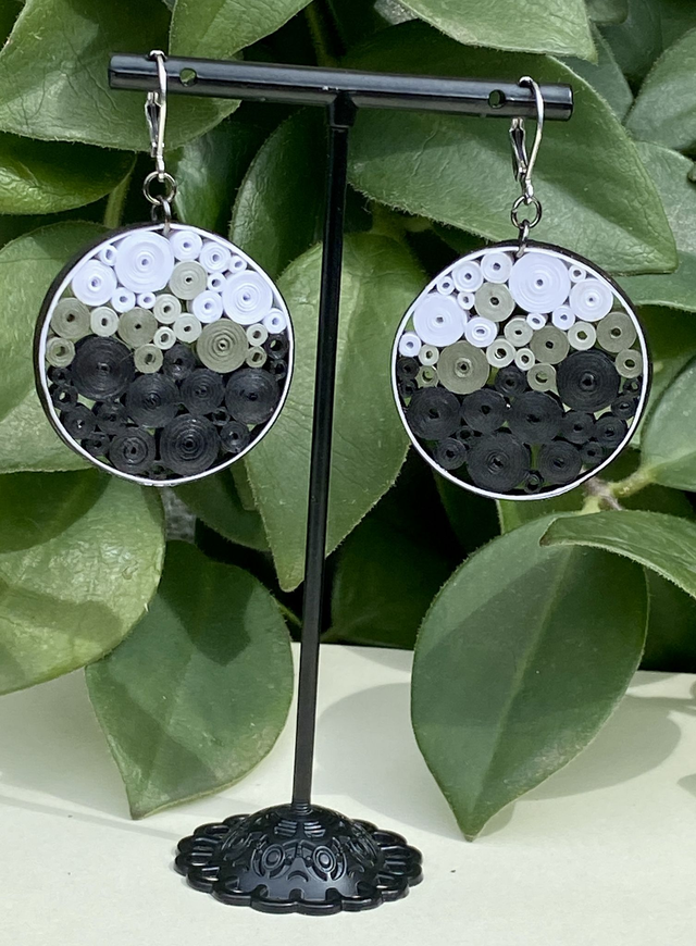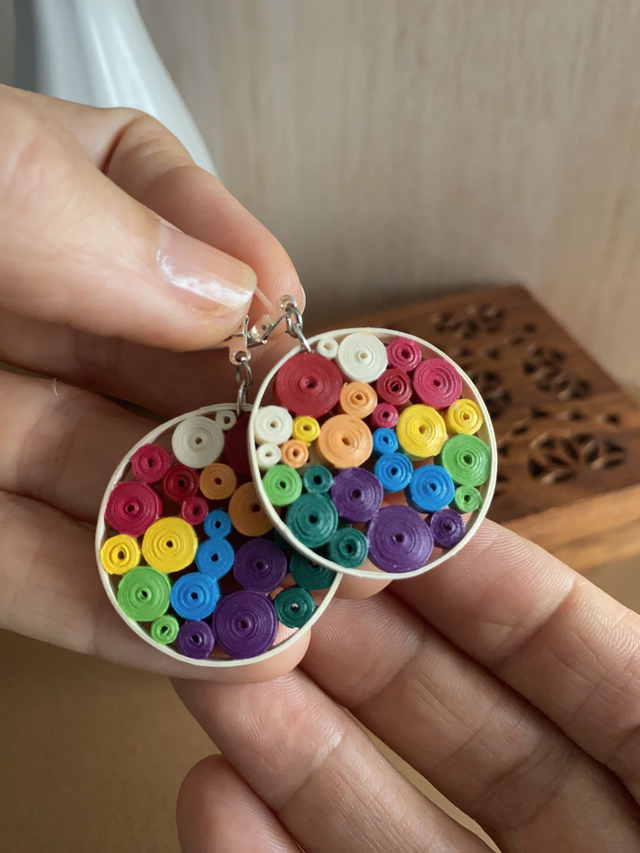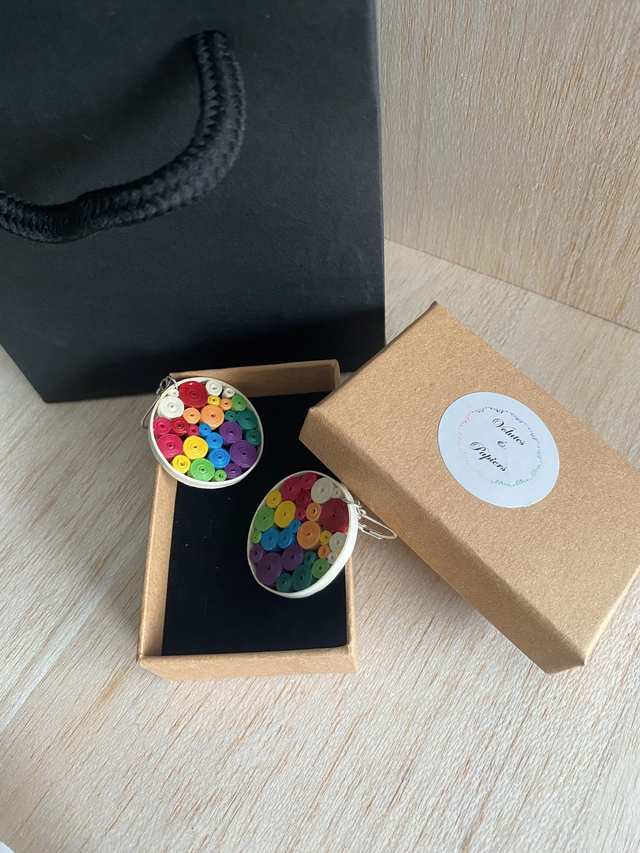 Chaque paire de boucles d'oreilles est réalisée à la main avec des bandes de papier roulé selon la technique du quilling, rendant chaque modèle unique. Il peut y avoir de petites variations d’une boucle à l’autre, ce qui fait leur charme.