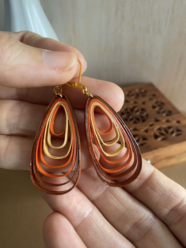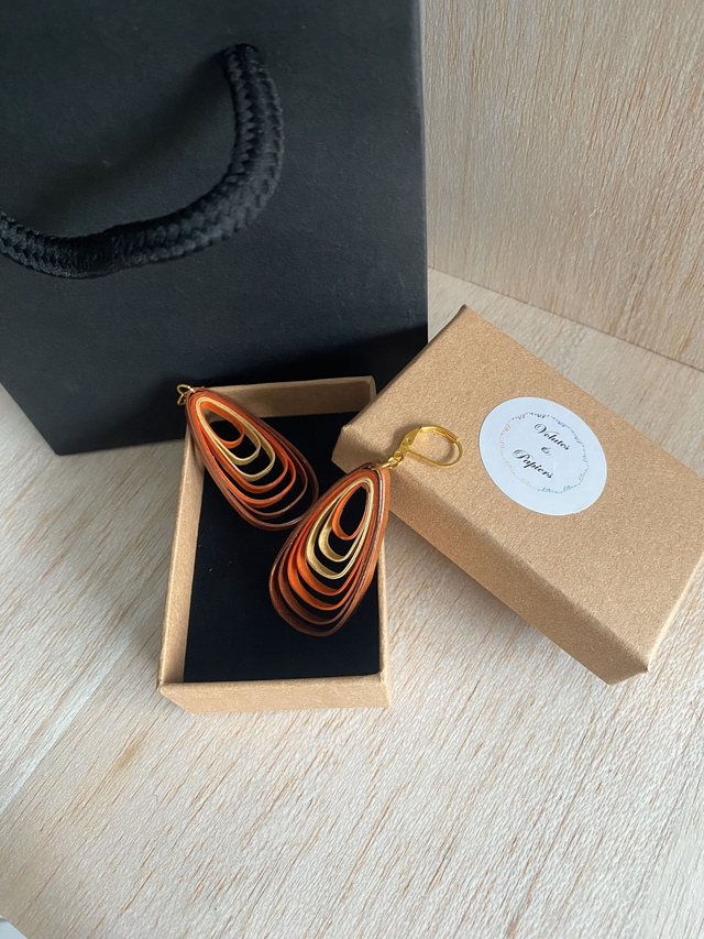 Chaque paire de boucles d'oreilles est réalisée à la main avec des bandes de papier roulé selon la technique du quilling, rendant chaque modèle unique. Il peut y avoir de petites variations d’une boucle à l’autre, ce qui fait leur charme.