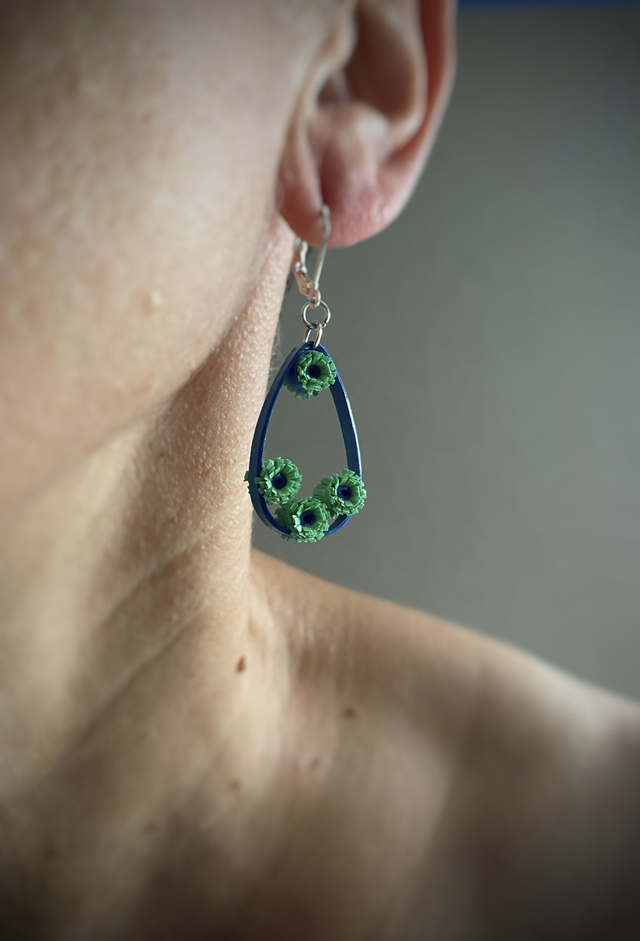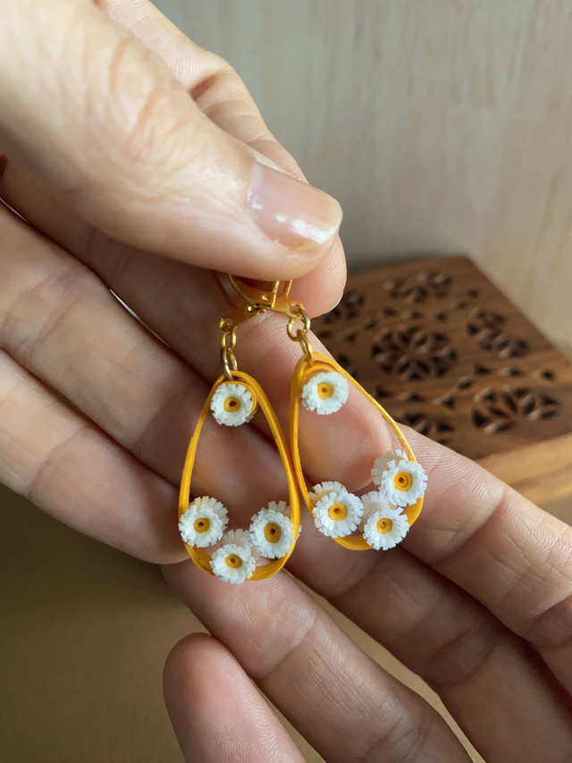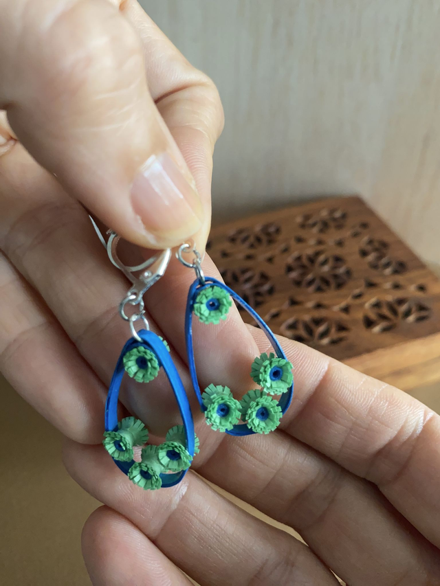 Chaque paire de boucles d'oreilles est réalisée à la main avec des bandes de papier roulé selon la technique du quilling, rendant chaque modèle unique. Il peut y avoir de petites variations d’une boucle à l’autre, ce qui fait leur charme.