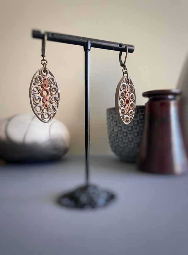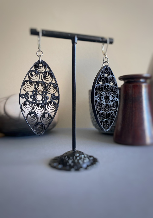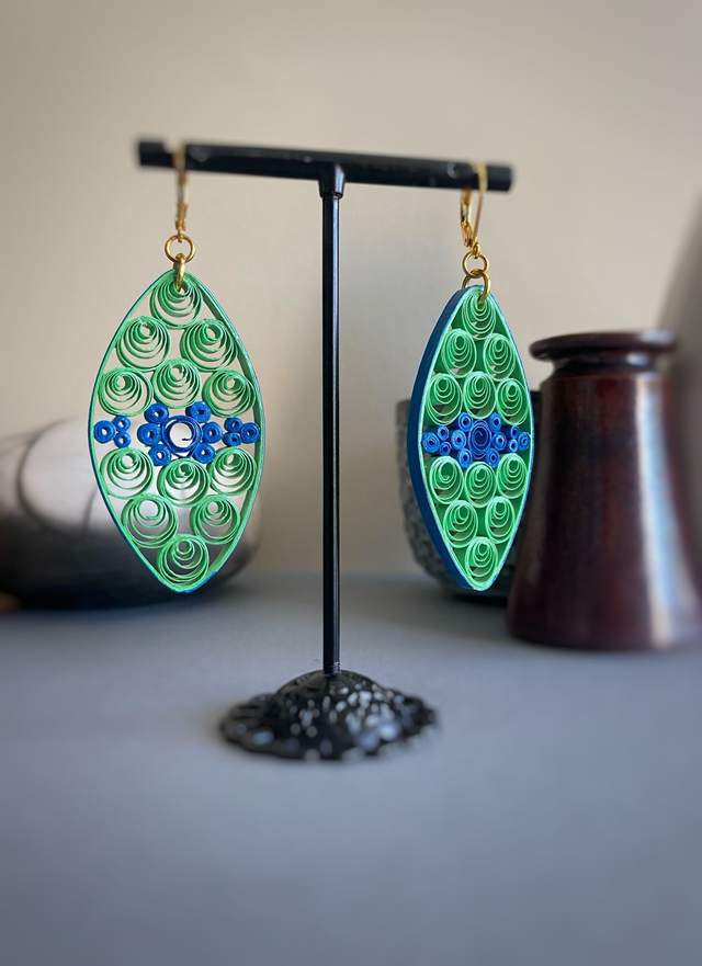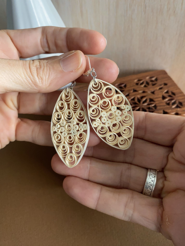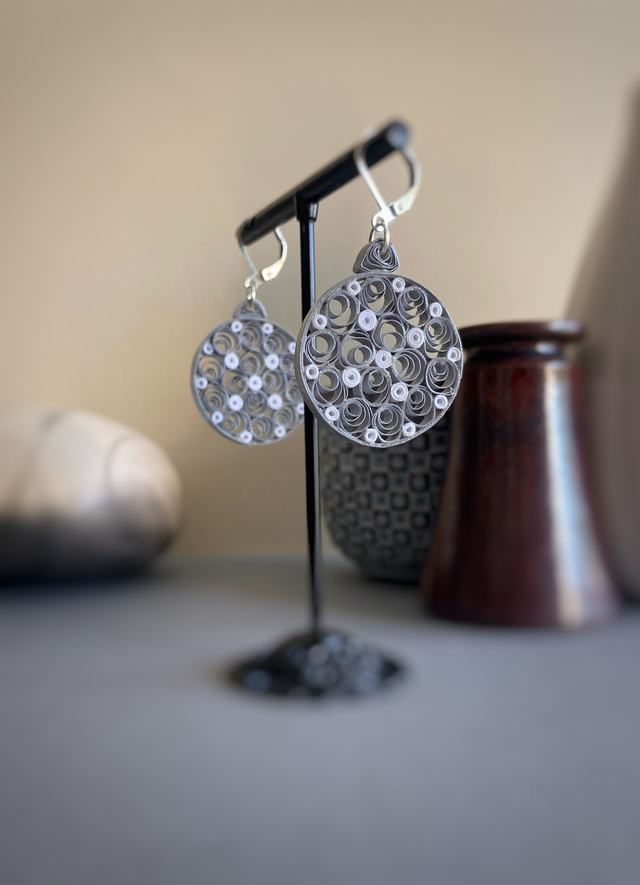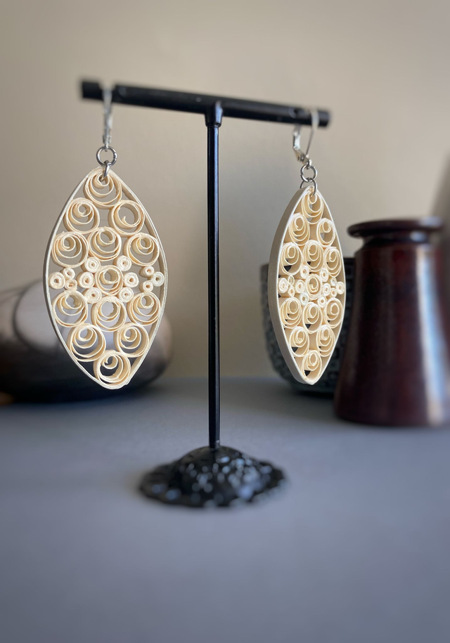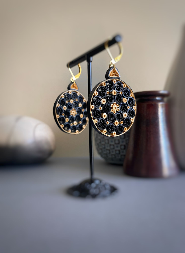 Chaque paire de boucles d'oreilles est réalisée à la main avec des bandes de papier roulé selon la technique du quilling, rendant chaque modèle unique. Il peut y avoir de petites variations d’une boucle à l’autre, ce qui fait leur charme.