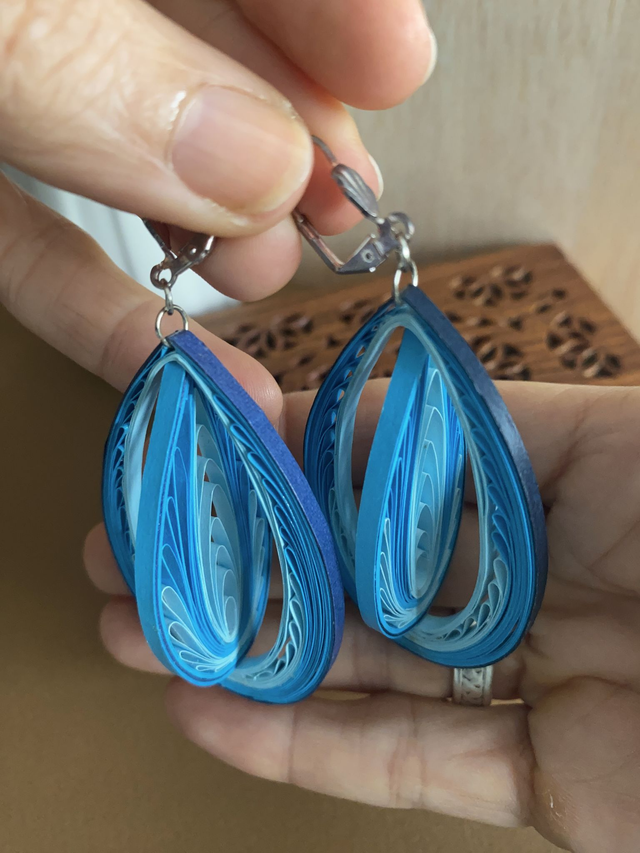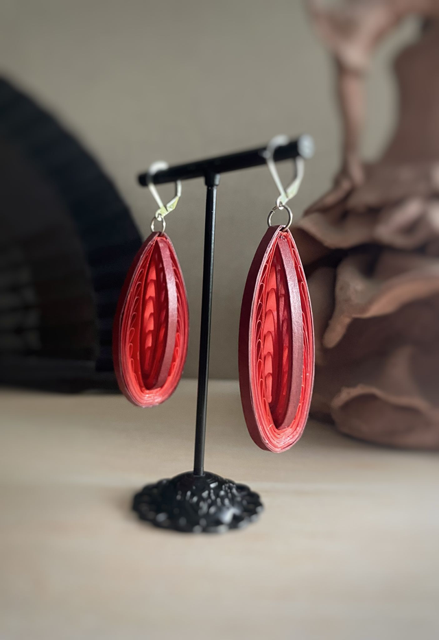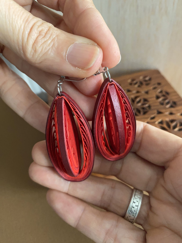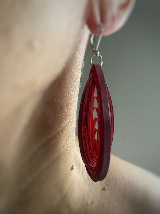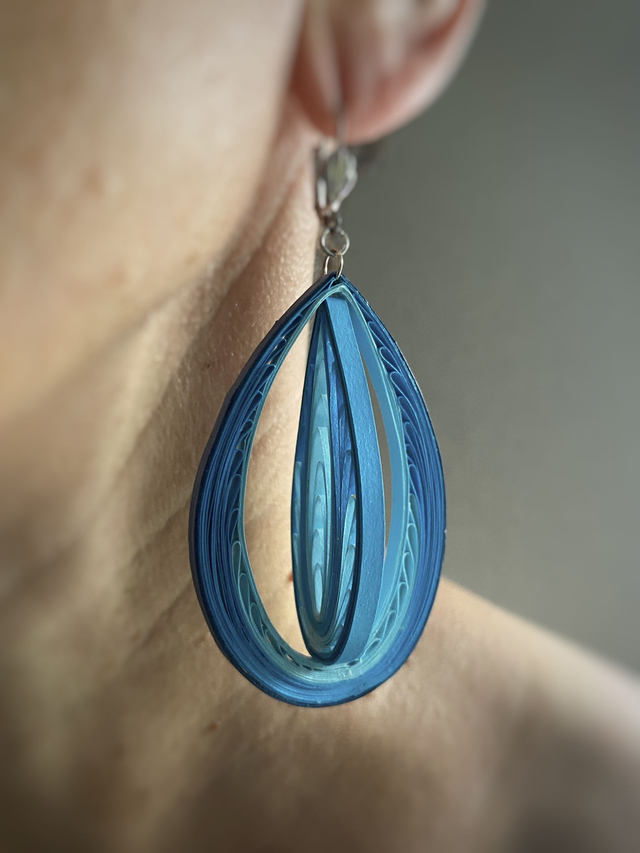 Chaque paire est façonnée à la main, en papier roulé selon la technique du quilling. Chaque création est donc absolument unique : de légères différences peuvent apparaître d’une boucle à l’autre, et c’est justement ce qui leur donne toute leur authenticité.